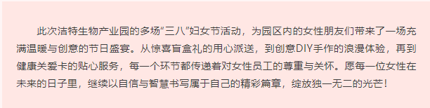溫暖三月天,燦爛芳華。2025年3月7日,為慶祝國(guó)際婦女節(jié)來(lái)臨,潔特生物產(chǎn)業(yè)園開(kāi)展了一系列豐富多彩的婦女節(jié)活動(dòng),形式多彩多樣,吸引了園區(qū)內(nèi)眾多女性朋友積極參與。